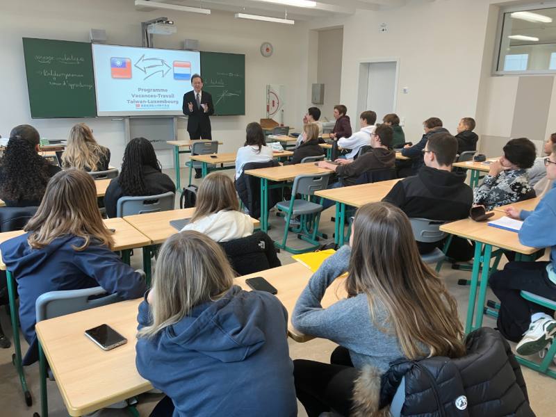 駐歐盟兼駐比利時代表處公使楊平齊日前應邀赴盧森堡Michel-Rodange高中向該校師生宣介台盧度假打工計畫之緣起、申請條件、台灣優良人文環境,以及台灣獎學金及華語文獎學金資訊等,鼓勵渠等赴台開拓視野、瞭解亞洲文化;另說明我政府設立之度假打工計畫專屬網站,以方便外國人在台學習中文、求職及旅行資訊等,歡迎渠等充分利用,雙方互動熱絡。