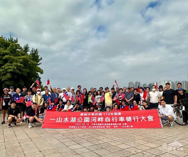 由中華民國體育總會韓國分會主辦的漢江自行車大會於9月16日上午舉行,在會長趙勝源的號召下,100多位僑胞齊聚高陽市一山湖水公園,沿著湖畔的自行車道進行一個小時的單車健行活動,當日駐韓國代表處代表梁光中伉儷及副代表齊永強、僑務組組長林季蓉也都踴躍參加,共同慶祝112年中華民國臺灣生日快樂。