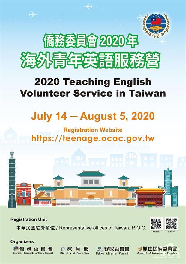 為鼓勵以英語為母語之海外青年來臺,前往偏遠或教學資源缺乏地區國中、小擔任英語教學志工,投入志願服務工作,提供偏鄉地區學童學習英語之機會,「2020年海外青年英語服務營」將於2020年7月14至8月5日舉辦,預計招募546位海外青年來臺服務。